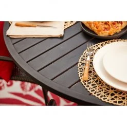 This 4-piece conversation set is a wonderful place to relax and entertain. This set includes 2 lounge chairs, 1 sofa that comfortably seats 3 people and a slat-top coffee table. The frames are made of durable steel. Cushions are included and the fabric is UV-treated and mildew-resistant.