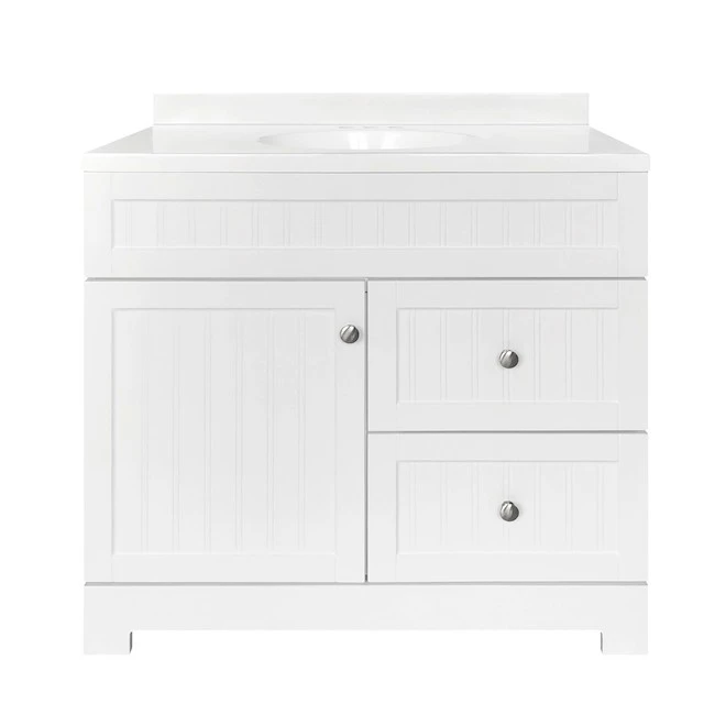 White vanity from the Ellenbee collection evokes the charm of a country cottage. White cultured marble top with a seamless integrated bowl and brushed nickel finish hardware adds a glossy accent. Great for classic and transitional style bathrooms and powder rooms. 1 cabinet door and 2 drawers provide storage space for all your everyday bath items